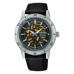 This Presage Style 60s is inspired by Sixties biker looks with a cutout dial pattern resembling a vintage motorcycle engine and its inner workings. Under the theme of ‘Elegant Yet Rugged,’ the design of this watch channels a strong dress style – a characteristic look of the 60s embodied in films from the time. The charcoal grey metal dial adds to the allure of the decorative gold-coloured movement beneath. This retro themed Style 60s watch has a slim lug design and laser-curved baton indices. On the right of the dial near to the logos, the straight line cutout pattern is designed to resemble the air-cooled engine of a vintage motorcycle. This watch is paired with a brown buffalo leather strap for an added flavour of the era which inspires its style.