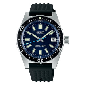 Seiko prospex 55th anniversary limited edition men's watch SLA043J1. Automatic movement with manual winding capacity. Ever brilliant steel case with a black silicone strap, blue dial. Case thickness: 14.1 mm, case diameter: 39.9 mm, case length: 47.9 mm. Water Resistance upto 200m / 660ft diver's. Box shaped sapphire crystal. Anti-reflective coating on inner surface. Lumibrite on hands, indexes and bezel. Screw case back. Screw-down crown. Unidirectional rotating bezel. Other Features: 26 jewels, date display, stop second hand function.