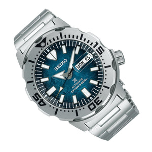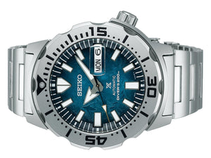 Seiko prospex antarctica monster 'Save The Ocean' automatic mens watch SRPH75K1. Stainless steel case and bracelet. Automatic movement with manual winding. Case size 42.4 mm. Water resistant upto 200 metres or 20 bars. Three-fold clasp with a secure lock and push-button release fastens the bracelet. The bracelet has an extender. Hardlex crystal protects the blue textured dial. The steel-coloured bezel is unidirectional. Penguin silhouettes can be seen on the left-hand side of the dial. The large hands and hour-markers are luminescent. Features include a day and a date display.