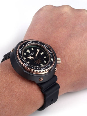 Seiko prospex automatic men's watch SBDX014G. Titanium case with a black silicone band, black dial. Automatic movement with manual winding. Water Resistance upto 1000m / 3300ft for saturation diving. Case thickness 17.2 mm, case diameter 52.4 mm, case length 53.5 mm. Sapphire crystal. Lumibrite on hands and indexes. Screw-down crown. Unidirectional rotating bezel. Other Features: 26 jewels, date display, stop second hand function.