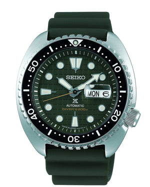 Seiko prospex automatic men's watch SRPE05. Stainless steel case with a green silicone strap, green dial. Automatic movement. Sapphire with magnified date window and anti-reflective coating on inner surface crystal. Buckle clasp. Round case shape. Case size 45 mm. Water resistant at 200 m.