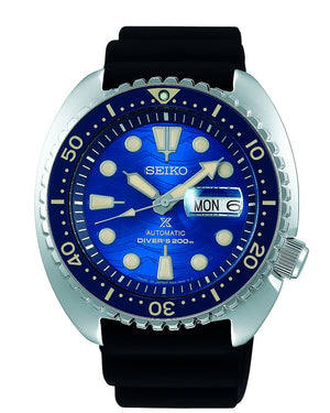 Seiko prospex automatic men's watch SRPE07. Stainless steel case with a black silicone strap, blue dial. Automatic movement. Sapphire with magnified date window and anti-reflective coating on inner surface crystal. Buckle clasp. Round case shape. Case size 45 mm. Water resistant at 200 m.