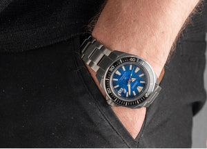 Seiko prospex automatic men's watch SRPE33. Stainless steel case with a stainless steel bracelet, blue dial. Automatic movement. Sapphire with magnified date window and anti-reflective coating on inner surface crystal. Three-fold clasp with push button release. Round case shape. Case size 43.8 mm. Water resistant at 200 m.