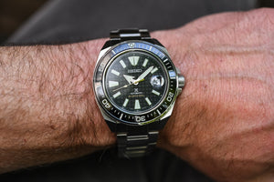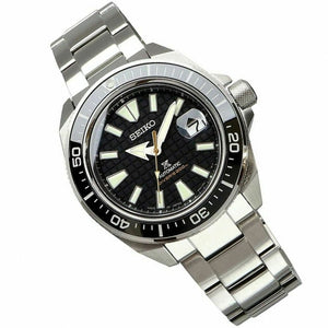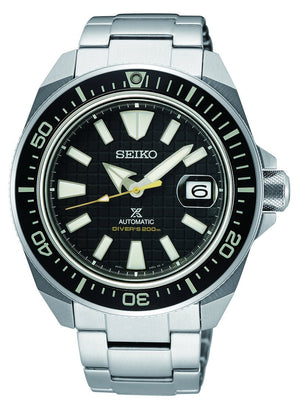 Seiko prospex automatic men's watch SRPE35. Stainless steel case with a stainless steel bracelet, black dial. Automatic movement. Sapphire with magnified date window and anti-reflective coating on inner surface crystal. Three-fold clasp with push button release. Round case shape. Case size 43.8 mm. Water resistant at 200 m.