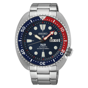 Seiko prospex automatic mens watch SRPE99. Stainless steel case and bracelet, blue dial. Case size 45 mm. Water resistance upto 200 meters. Automatic movement. Hardlex crystal. Three-fold clasp with push button release.
