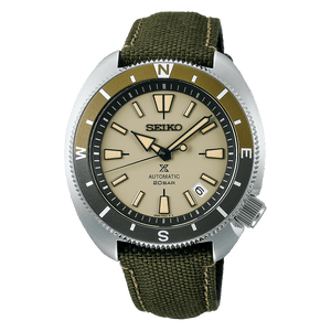 Seiko prospex automatic mens watch SRPG13. Stainless steel case with a Polyester strap, green dial. Case size 42.4 mm. Water resistance upto 200 meters. Automatic movement. Sapphire crystal. Buckle clasp.
