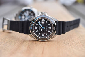Seiko prospex automatic mens watch SRPG21K1. Stainless steel case with a Silicone strap, black dial. Case size 43.8 mm. Water resistance upto 200 meters. Automatic movement. Sapphire crystal with magnifier. Three-fold clasp with secure lock , push button release with extender.