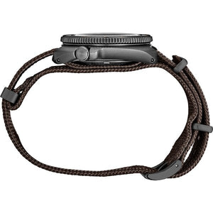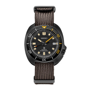 Seiko prospex black series limited edition automatic mens watch SPB257J1. Black plated stainless steel case with brown polyester strap and black dial. Case thickness 13.2mm, case diameter 42.7mm. Curved sapphire crystal. Anti reflective coating on crystal inner surface. Water resistance up to 200 meters / 660ft diver's. Buckle clasp. LumiBrite on hands, indexes and bezel. Stop seconds hand function. Date display. LIMITED EDITION on the case back. Serial number engraved on the case back. Unidirectional rotating bezel. Screw down crown. Screw case back.