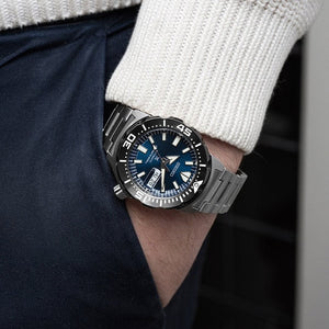 Seiko Prospex Mens Divers Watch (SRPD25K1F). Caliber 4R36 automatic movement with a 41 hours power reserve. Luminescent hands and index hour markers. Blue dial with a day/date window at the 3 o'clock position. Uni-directional black bezel set on a 43 mm stianless steel case. Hardlex crystal on top and a solid case-back. Water resistant to 200M. Stainless steel bracelet with a triple folding deployment clasp.