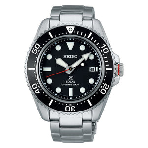 Seiko prospex sea solar mens watch SNE589. Stainless steel case and bracelet with black dial. Solar movement. Sapphire crystal. Three fold clasp with secure lock, push button release with extender. Round case shape. Case size 42.8mm. Water resistance up to 200 meters.