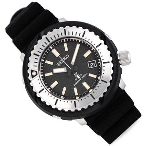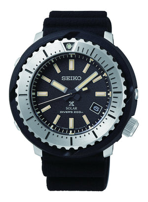 Seiko prospex solar men's watch SNE541. Black hard-coating case with a black silicone strap, black dial. Solar movement. Hardlex crystal. Buckle clasp. Round case shape. Case size 46.7 mm. Water resistant at 200 m.