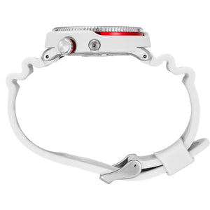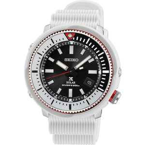 Seiko prospex solar men's watch SNE545P1. Stainless steel case with a white silicone band, black dial. Solar movement, hardlex crystal. Lumibrite on hands and indexes. Water resistance upto 200m / 660ft diver's. Case thickness: 12.6 mm, case diameter: 46.7 mm, case length: 46.1 mm. Screw case back. Screw-down crown. Unidirectional rotating bezel. Other Features: date display, overcharge prevention function, quick-start function.