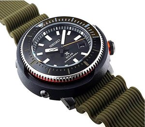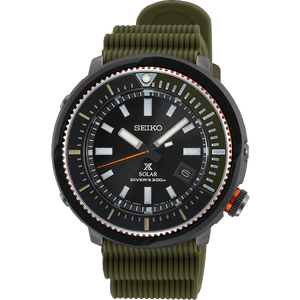 Seiko prospex solar men's watch SNE547P1. Stainless steel case with a green silicone band, black dial. Solar movement, hardlex crystal. Water resistance upto 200m / 660ft diver's. Case thickness 12.6 mm, case diameter 46.7 mm, case length 46.1 mm. Lumibrite on hands and indexes. Screw case back. Screw-down crown. Unidirectional rotating bezel. Other Features: date display, overcharge prevention function, quick-start function.