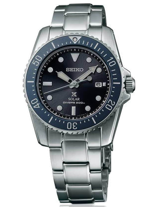 Seiko prospex solar mens watch SNE569. Stainless steel case and bracelet, black dial. Case size 38.5 mm. Water resistance upto 200 meters. Solar movement. Sapphire crystal. Three-Fold Clasp With Secure Lock, Push Button Release With Extender.