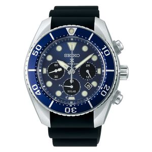 Seiko prospex solar mens watch SSC759J1. Stainless steel case with a black silicone strap and blue dial. Solar movement. Case thickness: 13.7 mm, case diameter: 44.5 mm, case length: 51.6 mm. Water resistance upto 200 meters / 660ft diver's. Sapphire crystal. Lumibrite on hands and index(es). Other Specifications: screw case back, screw-down crown, unidirectional rotating bezel. Other Features: 24-hour hand, chronograph up to 60 minutes in 1/5 second increments, date display, display function of resuming electric power generation, equipped with small seconds hand, overcharge prevention function.