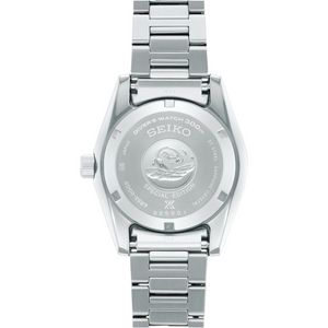 Seiko Special Edition Prospex SPB455J1. Stainless steel case and bracelet with grey dial. Automatic movement. Water resistance up to 300 meters. Curved sapphire crystal Anti-reflective coating on inner surface. Three-fold clasp with secure lock , push button release with extender.
