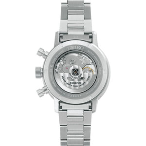 Seiko prospex speedtimer automatic mens watch SRQ043J1. Stainless steel case and bracelet with blue dial. Case size 42.5mm. Automatic movement. Water resistance up to 100 meters. Dual curved sapphire crystal. Anti reflective coating on crystal inner surface. Three fold clasp with push button release. LumiBrite on hands and indexes. Equipped with small seconds hand. Stop second hand function. See through and screw case back.