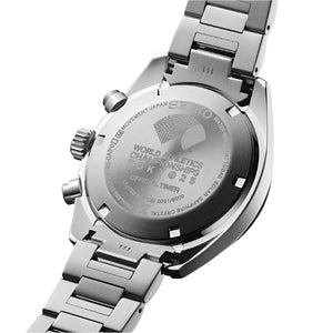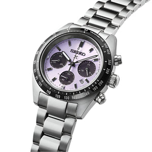 Seiko Prospex Speedtimer solar limited edition mens watch SSC955P1. Stainless steel case and bracelet with purple dial. Solar movement. Three-fold clasp with push button release. Curved Sapphire Crystal with Anti-reflective coating inner surface.