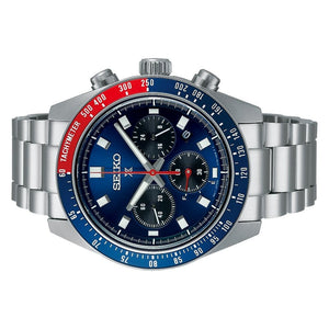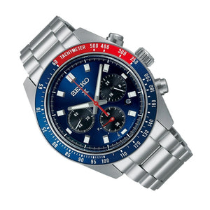 Seiko Prospex prospex speedtimer solar mens watch SSC913. Stainless steel case and bracelet with blue dial. solar movement. Sapphire with anti-reflecting coating on inner surface. Three-fold clasp with push button release. Round case shape. Case size 41.4mm. Water resistance up to 100 meters.