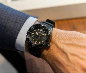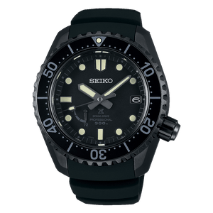 Seiko prospex spring drive mens watch SNR031J1. Titanium (super-hard coating) case with a Silicone strap, black dial. Case size 44.8 mm. Water resistance upto 300 meters. Spring Drive movement. Curved sapphire crystal. Pin buckle clasp.