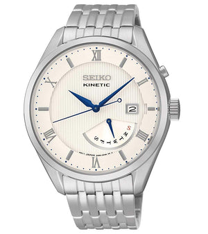 Stainless steel case with a stainless steel bracelet. Fixed stainless steel bezel. White dial with blue hands and Roman numeral and index hour markers. Minute markers around the outer rim. Dial Type: Analog. Date display at the 3 o'clock position. day of the week display. Seiko Caliber 5M84 auto-quartz movement with about 6 months of power reserve. Scratch resistant hardlex crystal. Skeleton case back. Case size: 42 mm. Case thickness: 13 mm. Round case shape. Band width: 19 mm. Fold over with double push button release clasp. Water resistant at 100 meters / 330 feet. Functions: date, hour, minute, second. Casual watch style. Watch label: Japan Movt. Seiko Kinetic White Dial Stainless Steel Mens Watch SRN055.