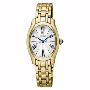 Seiko quartz gold tone womens watch SXGP60. Gold tone stainless steel case and bracelet, white dial. Analog watch with quartz movement Scratch resistant Hardlex window Beautifully sculpted cabochon crown. Case diameter measures 23.2 mm. Water resistant upto 50 meters.