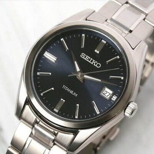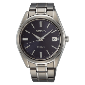 Seiko quartz mens watch SUR373. Titanium case and bracelet, navy dial. Case size 40.2 mm. Water resistance upto 100 meters. Quartz movement. Sapphire crystal. Three-fold clasp with push button release.