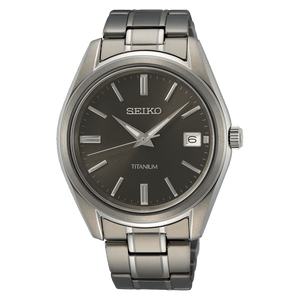 Seiko quartz mens watch SUR375. Titanium case and bracelet, gray dial. Case size 40.2 mm. Water resistance upto 100 meters. Quartz movement. Sapphire crystal. Three-fold clasp with push button release.