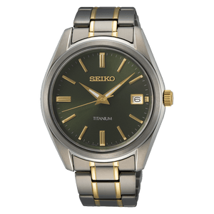 Seiko quartz mens watch SUR377. Titanium case and bracelet, green dial. Case size 40.2 mm. Water resistance upto 100 meters. Quartz movement. Sapphire crystal. Three-fold clasp with push button release.