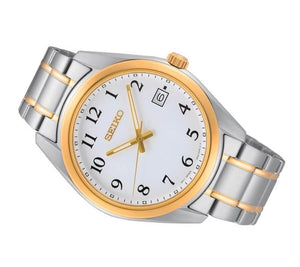 Seiko quartz mens watch SUR460. Two Tone stainless steel case and bracelet, white dial. Case size 40.2 mm. Water resistance upto 100 meters. Quartz movement. Sapphire crystal. Three fold clasp with push button release.