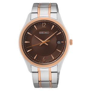 Seiko quartz mens watch SUR470. Two tone stainless steel case and bracelet, brown dial. Case size 39.4 mm. Water resistance upto 100 meters. Quartz movement. Sapphire crystal. Three fold clasp with push button release.