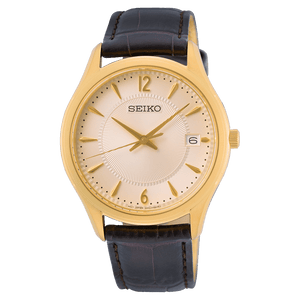 Seiko quartz mens watch SUR472. Gold-plated case with a Genuine leather strap, yellow dial. Case size 39.4 mm. Water resistance upto 100 meters. Quartz movement. Sapphire crystal. Buckle clasp.