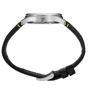 Seiko quartz mens watch SUR517. Stainless steel case with black nylon strap and black dial. Quartz movement. Sapphire crystal. Buckle clasp. Round case shape. Case size 39.5mm. Water resistance up to 100 meters.