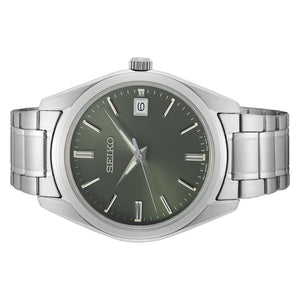 Seiko quartz mens watch SUR527. Stainless steel case and bracelet with green dial. Quartz movement. Sapphire crystal. Three fold clasp with push button release. Round case shape. Case size 40.2mm. Water resistance up to 100 meters.