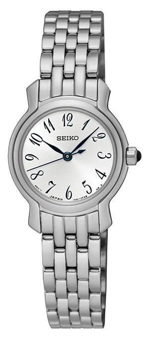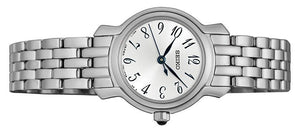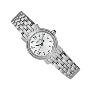 Seiko quartz stainless steel womens watch SXGP63. Stainless steel case and bracelet, white dial. Analog watch with quartz movement Beautifully sculpted cabochon crown Scratch resistant Hardlex crystal window. Water resistance up to 50 meters. Case diameter measures 22.3 mm.