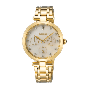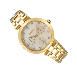 Seiko quartz womens watch SKY064. Gold-plated case and bracelet, mother of pearl dial. Case size 32.5 mm. Water resistance upto 50 meters. Quartz movement. Sapphire crystal. Three-fold clasp with push button release.