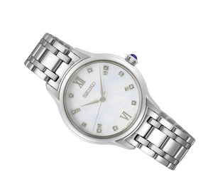 Seiko quartz womens watch SRZ537. Stainless steel case and bracelet, mother of pearl dial. Case size 29.5 mm. Water resistance upto 50 meters. Quartz movement. Sapphire crystal. Three-Fold Clasp With Push Button Release.