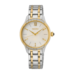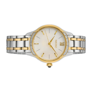 Seiko Quartz Women's Watch SRZ544. Two tone stainless steel case and bracelet. Yellow color dial. Automatic movement, Box shaped Hardlex crystal. Deployment clasp with push button release. Round case shape. Case size 29.5mm. Water resistant at 50 meters.