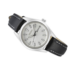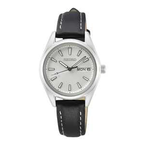 Seiko quartz womens watch SUR455. Stainless steel case with a Genuine leather strap, grey dial. Case size 29.8 mm. Water resistance upto 100 meters. Quartz movement. Sapphire crystal. Buckle clasp.