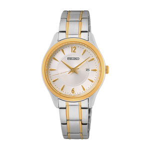 Seiko quartz womens watch SUR474. Two tone stainless steel case and bracelet, white dial. Case size 29.9 mm. Water resistance upto 100 meters. Quartz movement. Sapphire crystal. Three fold clasp with push button release.