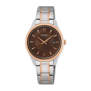 Seiko quartz womens watch SUR476. Two tone stainless steel case and bracelet, brown dial. Case size 29.9 mm. Water resistance upto 100 meters. Quartz movement. Sapphire crystal. Three fold clasp with push button release.