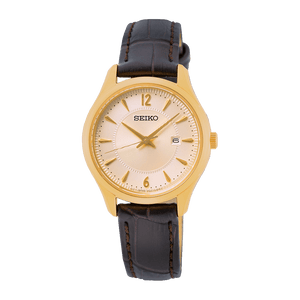 Seiko quartz womens watch SUR478. Gold-plated case with a Genuine leather strap, yellow dial. Case size 29.9 mm. Water resistance upto 100 meters. Quartz movement. Sapphire crystal. Buckle clasp.