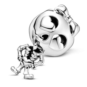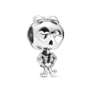 Get to know a new spooky friend the Skeleton girl charm. A halloween-themed charm decorated with hearts, this piece is hand-finished in sterling silver. Fall for this cute skeleton girl with cut-out dome and heart-shaped eyes, an upside-down heart for a nose and a skull topped with a bow. Including a heart shape that connects the skeleton’s dangling upper and lower body, this charm’s more sweet than scary.