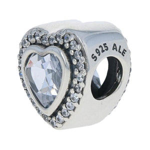 Make this sparkling charm hand-finished in sterling silver the glittering centrepiece of a favourite Pandora Moments bracelet. The double-sided love charm is centred with a brilliant cubic zirconia heart framed by smaller stones. Wear with other heart-shaped designs for a look of love or style it with your favourite Pandora charms.