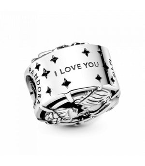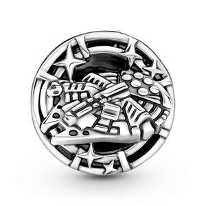Channel galactic love with the Star Wars Han Solo and Leia Kiss Charm. Hand-finished in sterling silver, this charm features Han Solo and Princess Leia kissing on one side and the Millennium Falcon spaceship on the other side. The sides of the charm are engraved with the characters' quotes from the scene: "I love you" and "I know". With intricate openwork details, including cut-out stars and facial features of the beloved characters, this charm represents an iconic Star Wars moment.