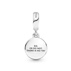 Be a true fan with the Star Wars Yoda Dangle Charm. Hand-finished in sterling silver, this charm includes two dangles, one an openwork design featuring Yoda standing with his gimer stick framed by raised ivy, the other a disc featuring hand-applied green and blue enamel with forest details. The backside of the second disc is engraved with "Do. Or do not. There is no try" and the bail is engraved with "Jedi master".
