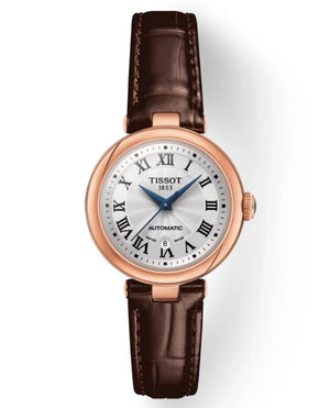 Tissot T-Lady Bellissima Automatic Ladies' watch. Powermatic 48 automatic movement power reserve up to 48 hours. Stainless steel case with rose gold PVD coating, 29.0 mm diameter, 10.0 mm high, silver dial with date at 6 o'clock. Leather strap with butterfly clasp with push-buttons, Domed scratch-resistant sapphire crystal with antireflective coating glass. Water-resistant up to a pressure of 5 bar (50 m / 165 ft).