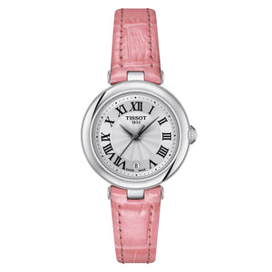 Tissot bellissima small lady quartz womens watch T1260101601301. Stainless steel with yellow gold PVD coating case with a pink leather strap and white dial. Quartz movement. Case size 26mm. Domed scratch resistant sapphire crystal with antireflective coating. Water resistance up to 50 meters. Butterfly clasp with push buttons.