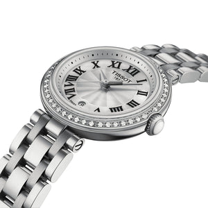 Tissot T-Lady quartz womens watch T1260106111300. Stainless steel case and bracelet with white mother of pearl dial. Quartz movement. Case size 26mm. Water resistance up to 50 meters. Domed scratch-resistant sapphire crystal with antireflective coating, Domed scratch resistant sapphire crystal with double sided antireflective coating. Butterfly clasp with push buttons.