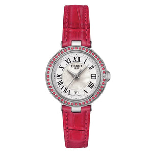 Tissot T-Lady quartz womens watch T1260106611300. Stainless steel case with pink leather strap, white mother of pearl dial. Quartz movement. Case size 26mm. Water resistance up to 50 meters. Domed scratch resistant sapphire crystal with antireflective coating, Domed scratch resistant sapphire crystal with double sided antireflective coating. Butterfly clasp with push buttons.
